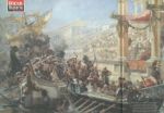 To jest ALEGORIĄ. Najważniejsi są tu NIE siedzący w loży Kleopatra z Antoniuszem, ale PŁYNĄCY CEZAR, którego chcą ratować 2 Murzyni z łodzi abordażowej. OBRAZ jest więc logiczną Kontynuacją medalionu CESAR AR 706 z wizerunkiem Cezara płynącego z KSIĘGĄ z Pałacu OKRĄGŁEGO, z którego powstańcy ciskają nań oszczepy, do Floty Rzymskiej po II stronie portu (Der Spiegel GESCHICHTE, NR. 2 / 2012, s. 53).